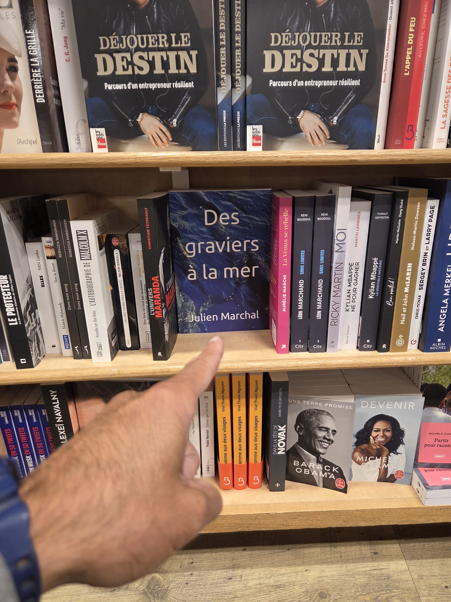 También sabía que podría venderlo directamente durante mi temporada como capitán de los cruceros de avistamiento de ballenas. Durante el verano de 2025, en alta mar o después de mi salida, ofrecía a los clientes la posibilidad de llevarse un recuerdo escrito, sobre todo cuando habíamos tenido un gran encuentro con mamíferos marinos. Colgué mi libro en la ventanilla de mi barco, junto con mi sitio web y estas tres palabras: Autobiografía de Julien Marchal. La gente tenía la opción de comprarlo allí mismo, en la tienda que había encima de la recepción. A veces los clientes me daban propinas, pero yo les sugería que compraran mi autobiografía, porque era un buen regalo. No vendí muchos ejemplares y, para ser sincero, al principio no tenía ni idea de cuántos iba a vender. En mi mente, distribuir unos pocos ya era mucho. Al final, vendí unos 25 ejemplares. A veces tenía tiempo entre crucero y crucero para firmar el libro, pero otras veces no, porque no tenía tiempo suficiente. Sobre todo porque los clientes tenían que devolver primero su ropa de vela y luego subir a la tienda. Esto podía llevar mucho tiempo, ya que había gente en todas las plantas.